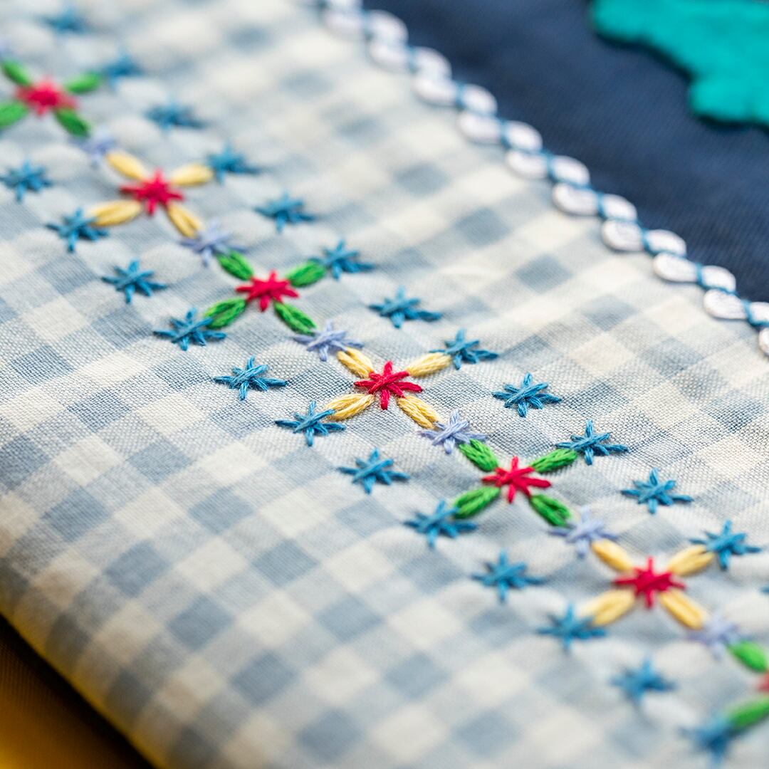 チェック生地のマス目を使う「ギンガムチェック刺しゅう」は生地と糸色の効果で思いがけない模様が浮かび上がる楽しいステッチ。シンプルな技法で初心者の方にもお勧めです。