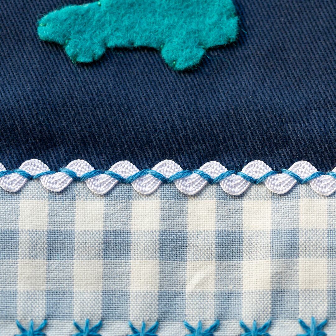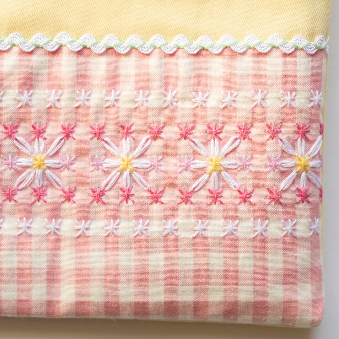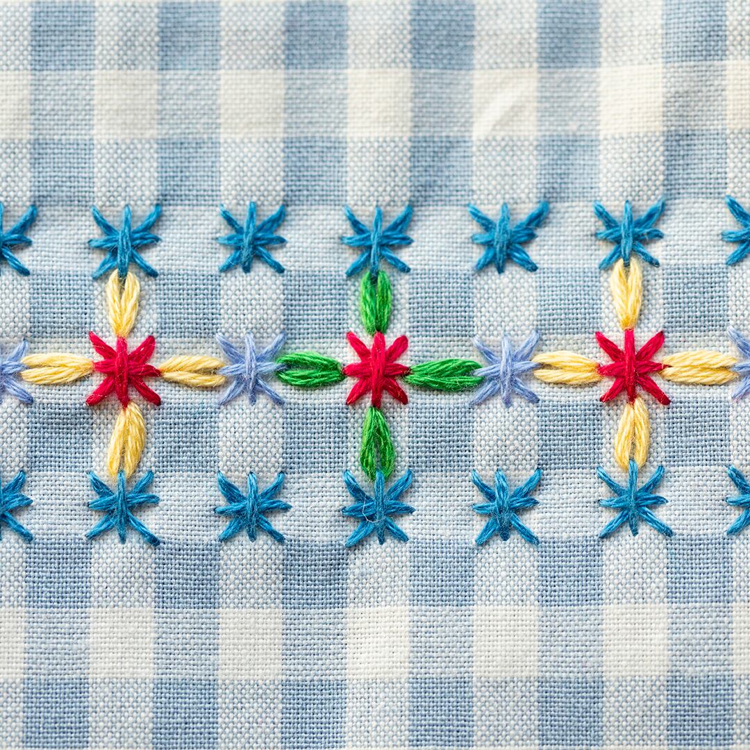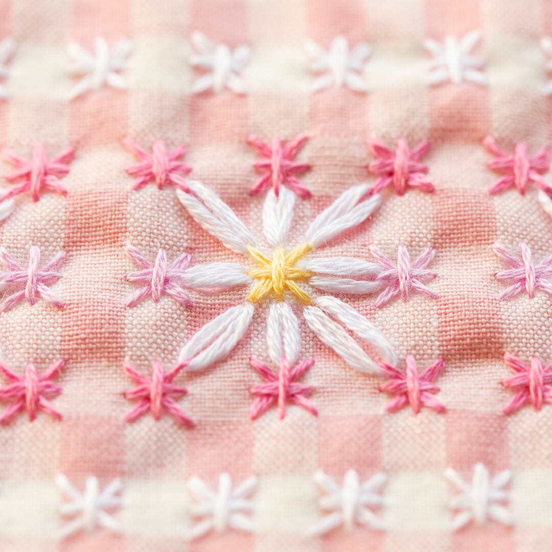シンプルなチェック地が様々な表情に変化する、ギンガムチェック刺しゅうを楽しんでくださいね。