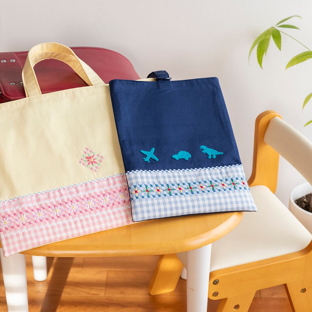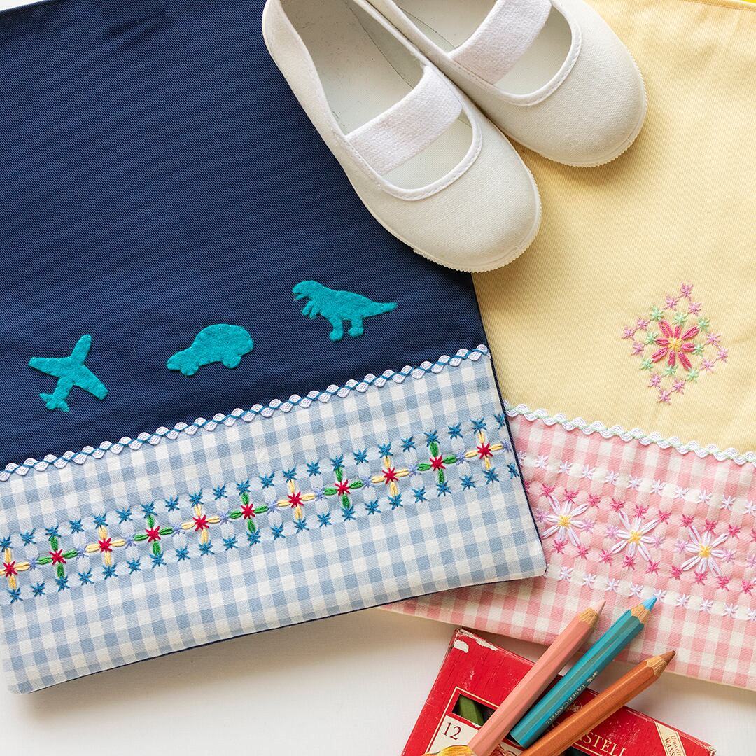 今回は入園・入学シーズンに向けてレッスンバッグと上履き入れに仕上げましたが、チェックのブラウスの胸元にステッチしたり、スカートの裾にダブルクロスステッチで模様を入れても楽しいです。